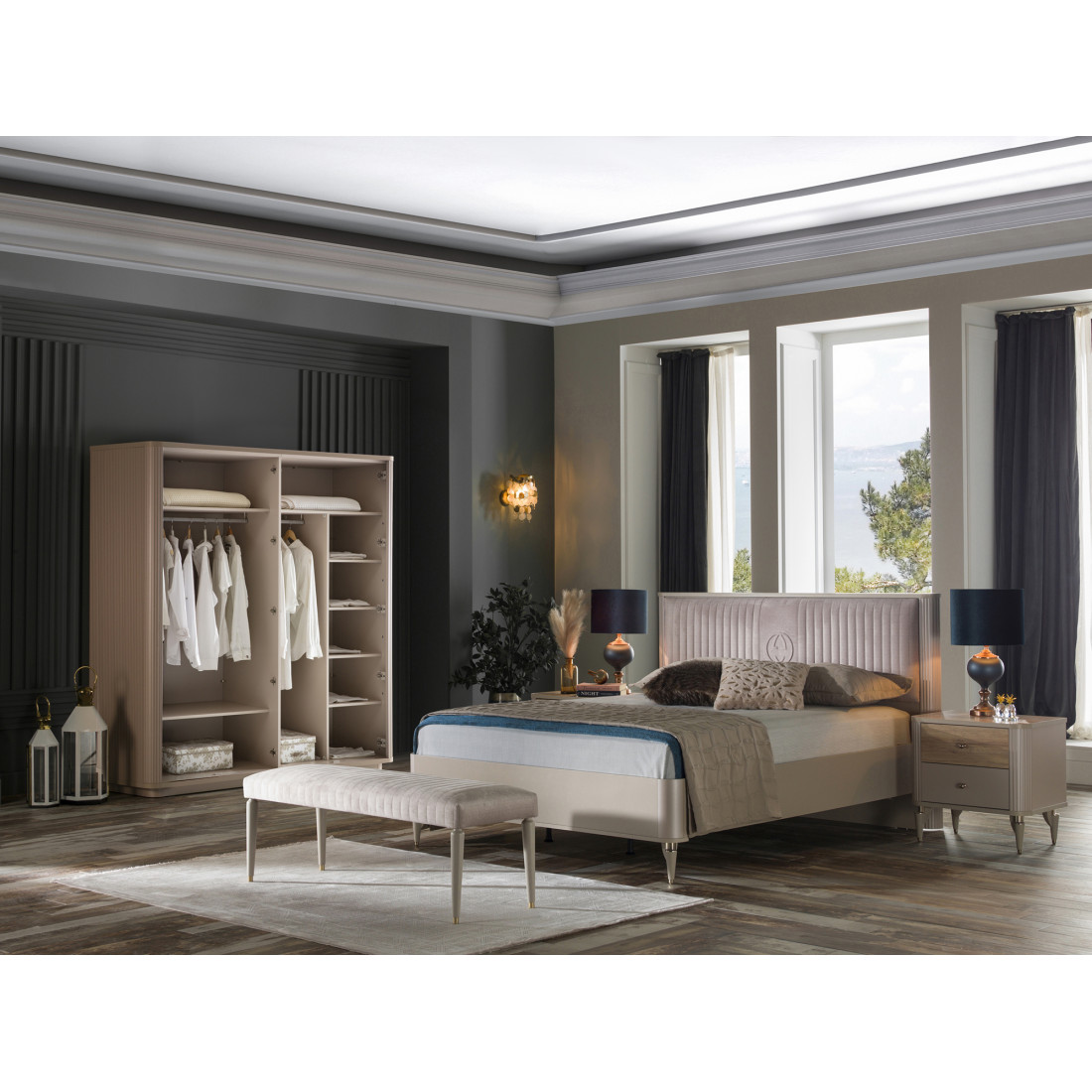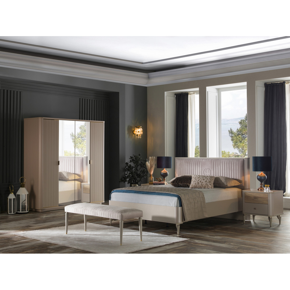 Четырехдверный шкаф Санвито SANV-20 прекрасно смотриться в купе с другими элементами спальни коллекции SANVITO: кроватью SANV-26, прикроватными тумбочками SANV-27, комодами SANV-23, SANV-28 и др.