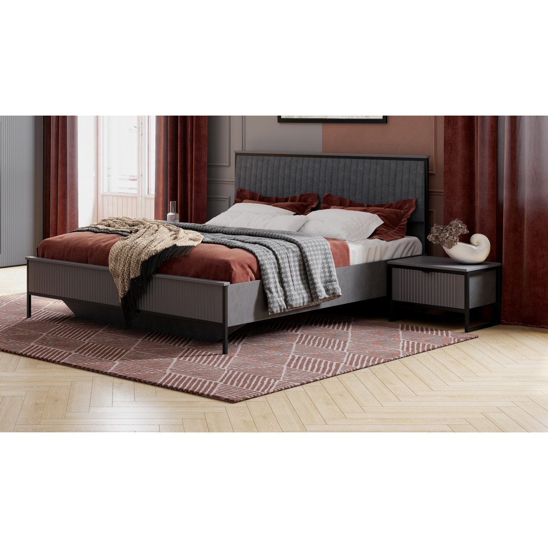 Дизайн коллекции гармонирует со стилем минимализм и лофт. Корпус изделий выполнен из качественного ЛДСП 16 мм цвета Металл Бруклин, фасады из МДФ 16 мм цвета Графит. Толщина металлических опор - 20 мм. Размеры спального места кровати: 160х200 см.