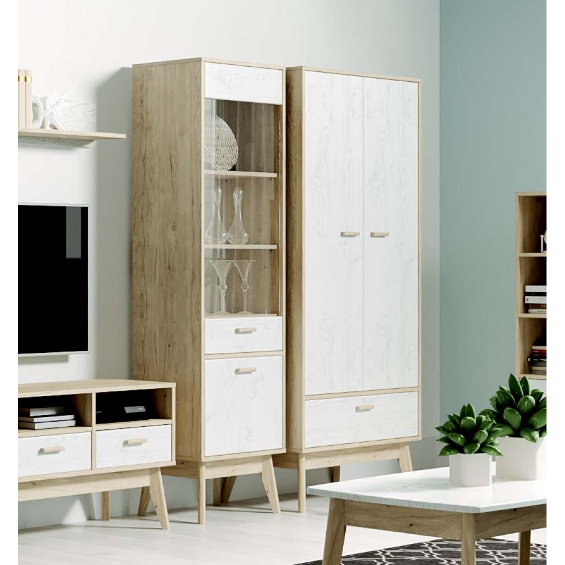 Ультратрендовая гостиная Калгари от Мебельград, выполненная в светлых тонах с элементами сдержанного стиля 60-х - высокие ножки, выраженная деревянная текстура натурального дуба, четкие формы. Вся мебель очень мобильная, компактная, вызывает чуство легкости и свободного пространства, при этом она функциональна.