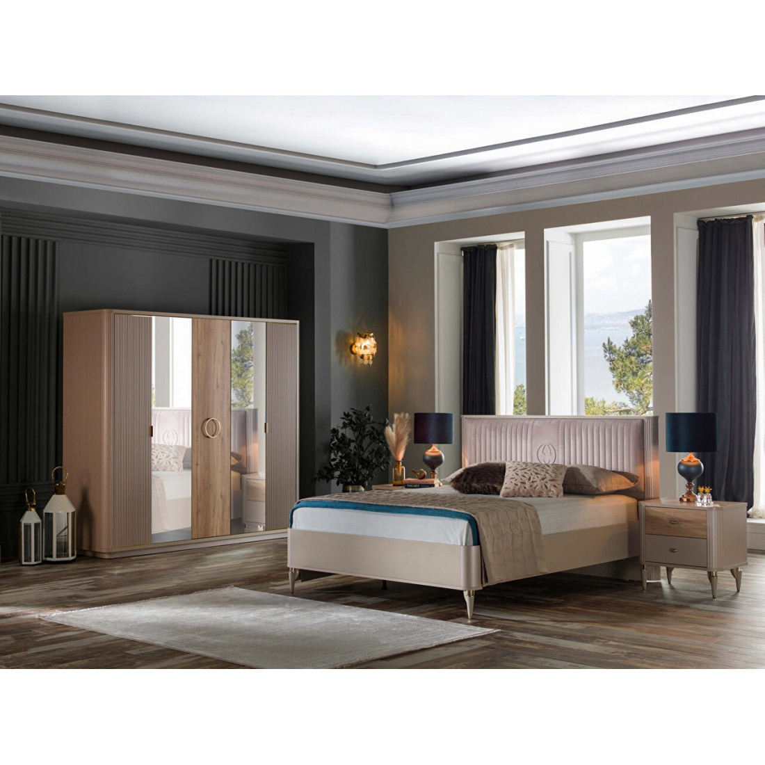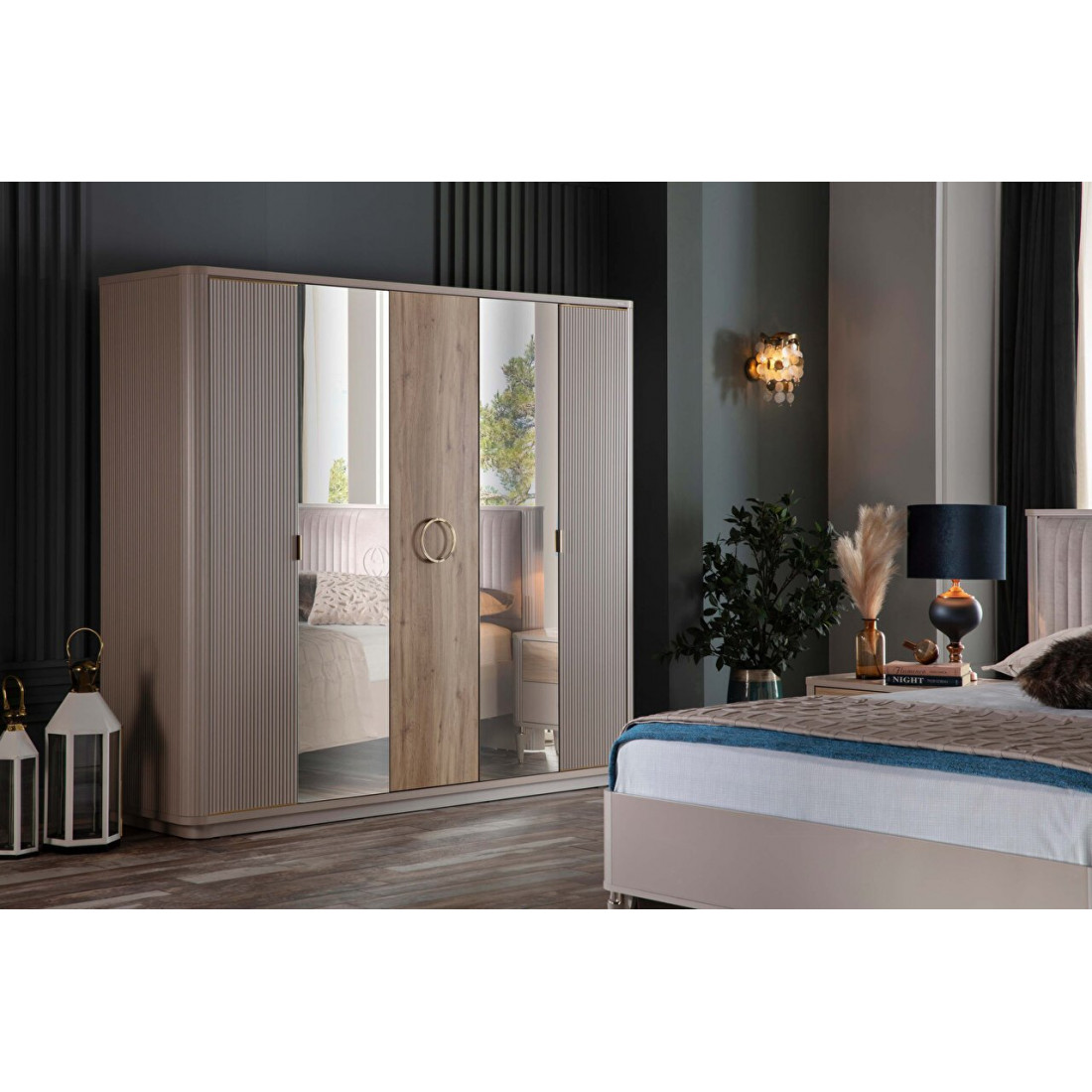 Пятистворчатый шкаф для спальни Санвито SANV-33 от турецкого бренда Bellona длиною 2260мм впечатляет своим дизайном и вместительностью.Наполнение шкафа предусматривает три отделения, каждое из которых позволяет удобно разместить предметы гардероба в нужном порядке. Шкаф изначально комплектуется множеством полок, штанг, а так же выдвижными ящиками. Особое внимание уделено дизайну шкафчика. Пять дверок комбинируются между собой. Крайние дверки фасада с рифленой поверхностью в цвете крем дополнены скругленными вставками с торца шкафа. Центральная дверь из древесного ЛДСП украшена круглой золотистой ручкой. Два зеркала во всю обрамляют центральную часть шкафа.