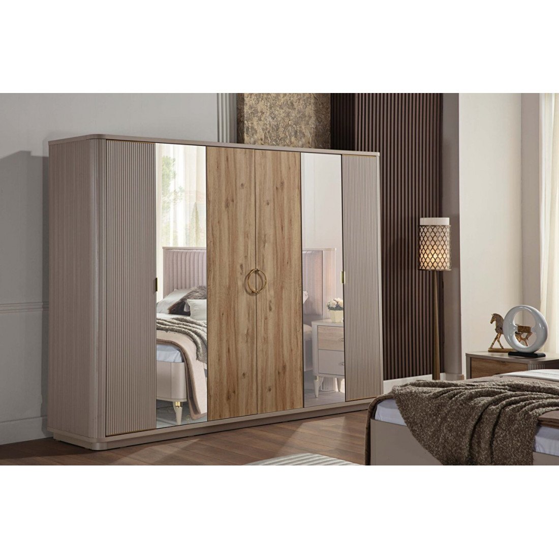 Шестистворчатый шкаф Санвито SANV-34 длиной 2,710 мм многофункциональный предмет вашего интерьера для хранения. Фасады шкафа представлены в комбинации трех видов дверей. По центру выделяется пара дверок из ЛДСП древесной фактуры с оригинальной круглой металлической ручкой. Рядом расположены зеркала на всю высоту шкафа, и завершают композицию кремовые фасады с рифленой поверхностью. Углы шкафа имеют скругленные формы.