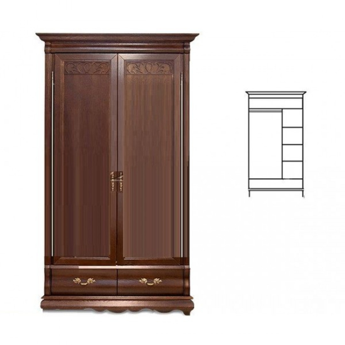 Массивный двухдверный шкаф для спальни из коллекции "Оскар" органично впишется в интерьер в классическом стиле. Высокие карнизы и романтичный резной узор придают модели изящества. Выдвижные бельевые ящики на направляющих. Фасад выполнен из массива дуба, модель окрашена в классический оттенок орех.