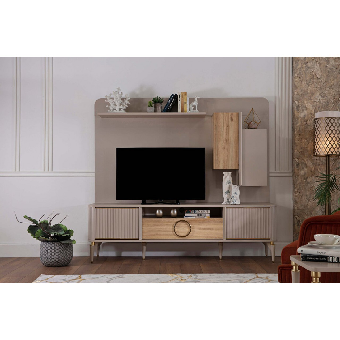 Стенка под ТВ Санвито SANV-15а - небольшая компактная стенка в стиле неоклассика, ар деко. Продолжая развивать коллекцию Санвито (SANVITO), турецкий бренд Беллона предлагает свои покупателям композицию SANV-15а из 3х модулей:Тумбы под ТВ SANV-15 +Часть мебельной стенки (панель+полка) SANV-15PP+Часть мебельной стенки (шкаф )SANV-15D.